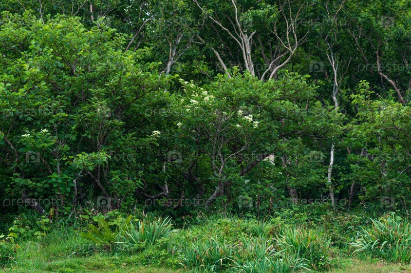 Лесной пейзаж острова Кунашир, цветущий кустарник и подлесок высокой травы