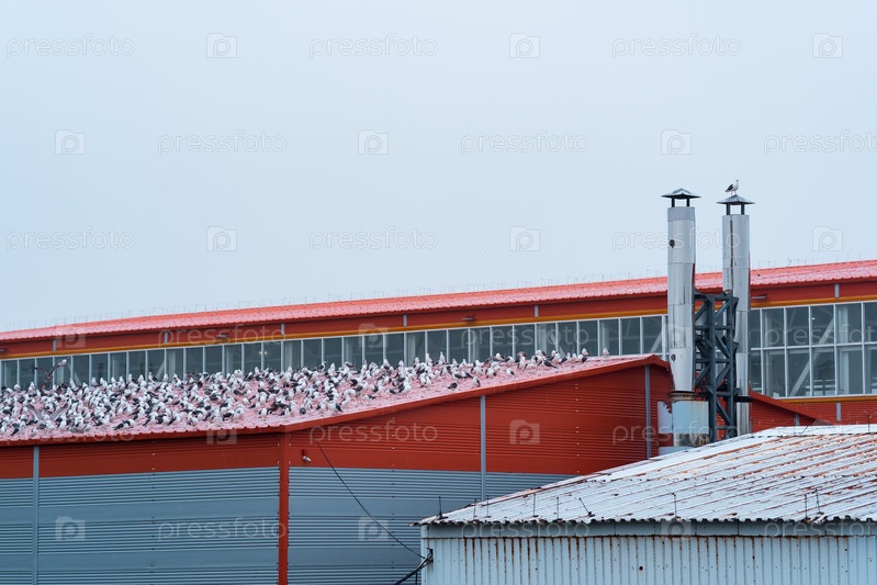 Промышленный пейзаж, множество чаек сидят на крыше рыбоперерабатывающего завода