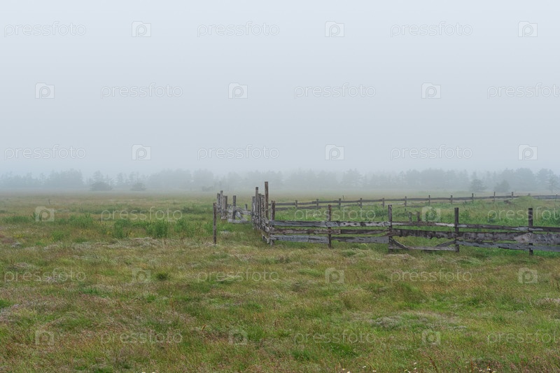 Сельский пейзаж, загон для скота на туманном лугу