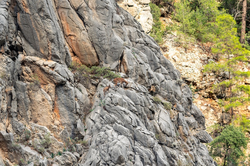 Горный пейзаж - отвесная скала с двумя сернами и лесистым склоном