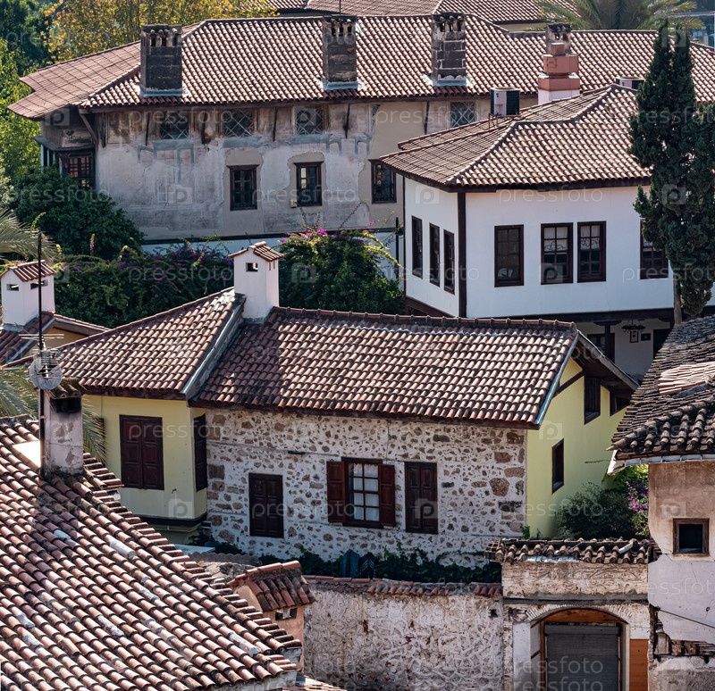 Вид на черепичные крыши старинных домов в историческом центре Антальи, Турция