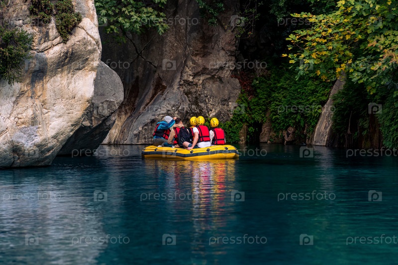 Туристы на надувной лодке сплавляются по каньону с голубой водой в Гейнюке, Турция