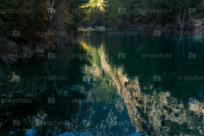 Осенний горный пейзаж с тенистым озером в ущелье
