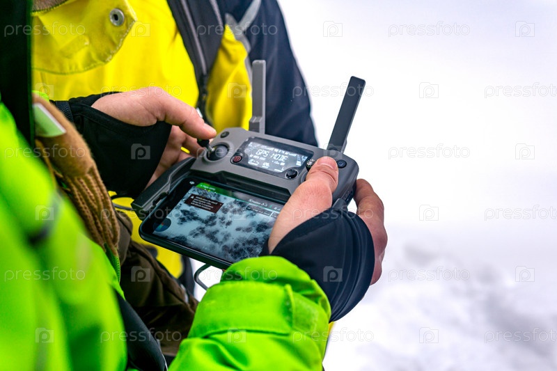 Пульт дистанционного управления беспилотным летательным аппаратом в руках оператора зимой