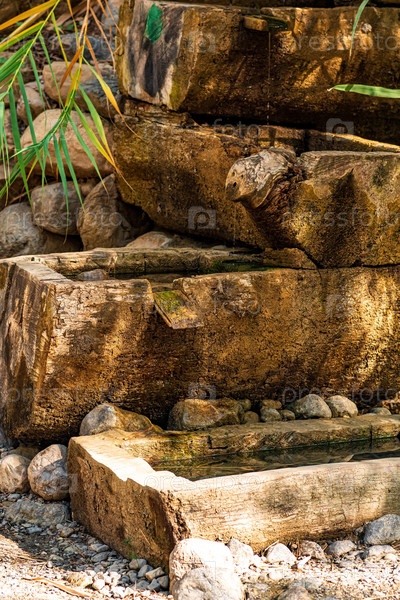 Природный источник воды, оформленный в виде деревянного каскада