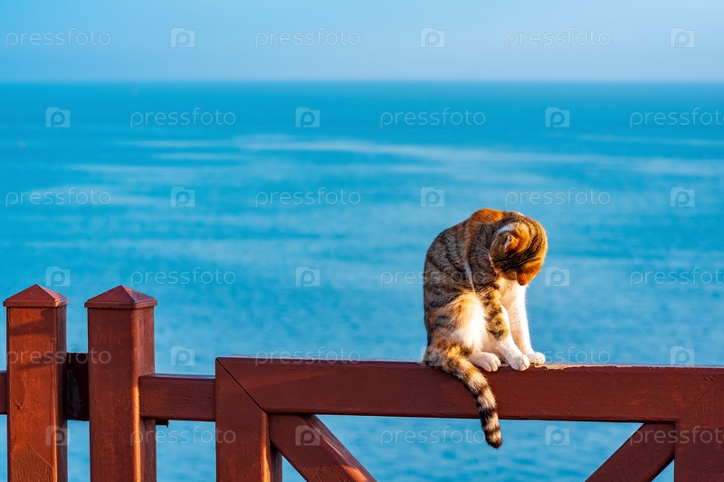 Кот облизывает шубу на заборе на фоне моря