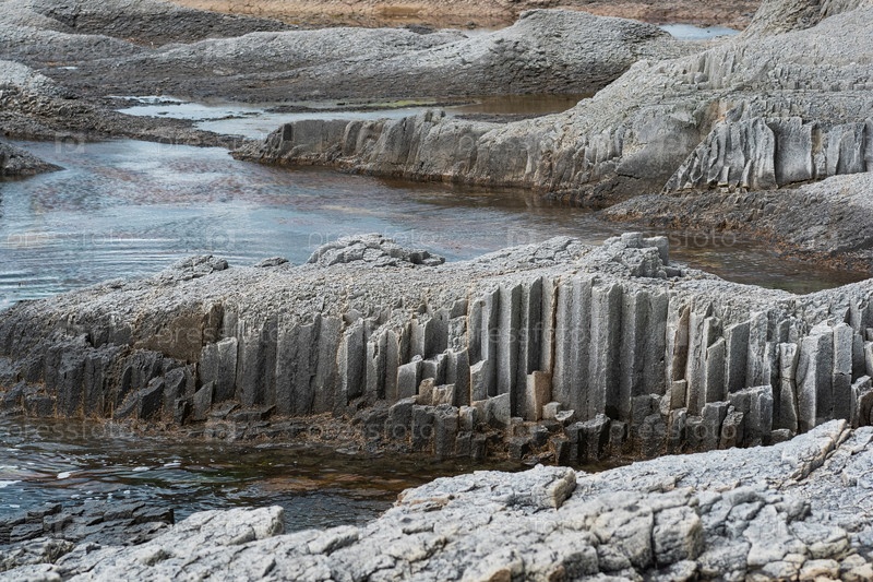 Прибрежный пейзаж с красивыми столбчатыми базальтовыми скалами во время отлива