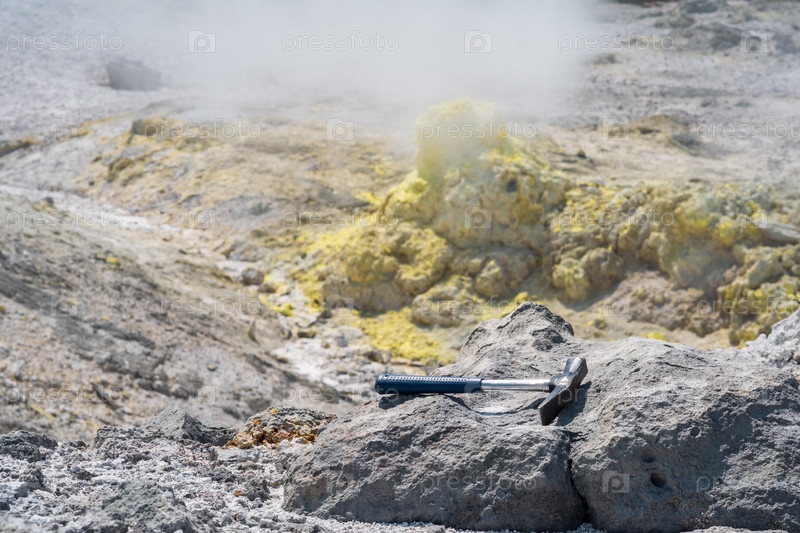Геологический молоток на скале на фоне дымящейся фумаролы на склоне вулкана