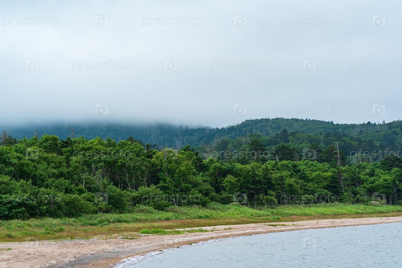 Берег озера в лесистой горной местности в пасмурную погоду, озеро Лагунное на острове Кунашир