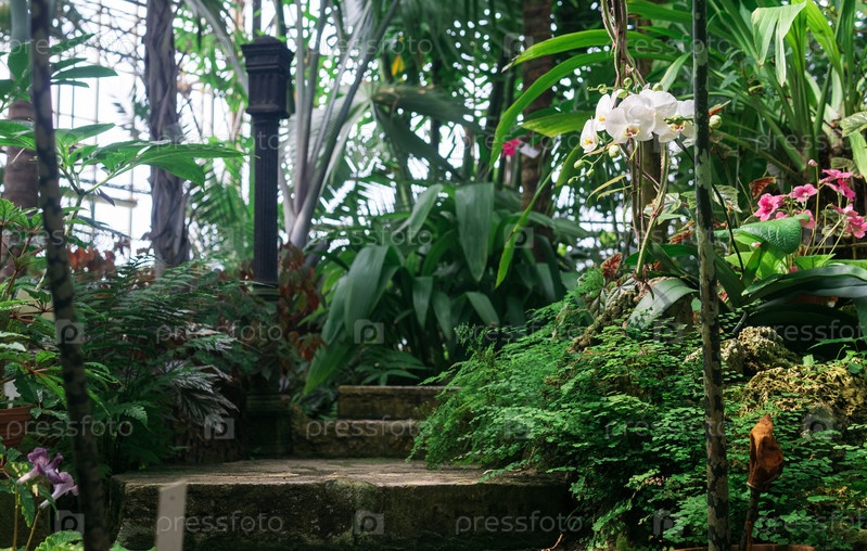 Интерьер старинной тропической оранжереи со ступеньками и старой чугунной колонной среди растений