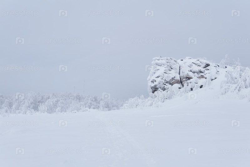 Скалистое плато, покрытое глубоким снегом под зимним небом, вдалеке в тумане видны вышки сотовой связи
