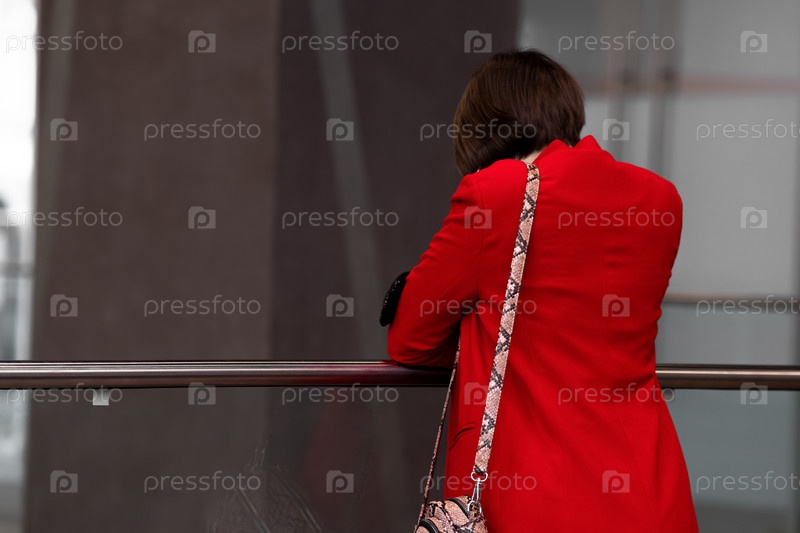 Молодая женщина в красном пальто стоит спиной к зрителю в холле общественного здания