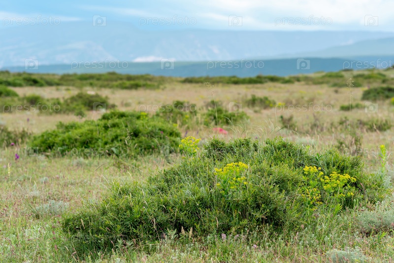 Частично размытый пейзаж с цветущей весенней горной степью, сосредоточьтесь на близлежащей растительности