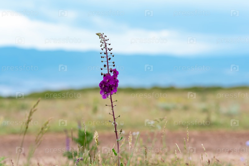 Красивый фиолетовый цветок коровяка на фоне размытого весеннего пейзажа