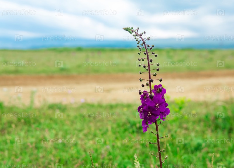 Красивый фиолетовый цветок коровяка на фоне размытого весеннего пейзажа