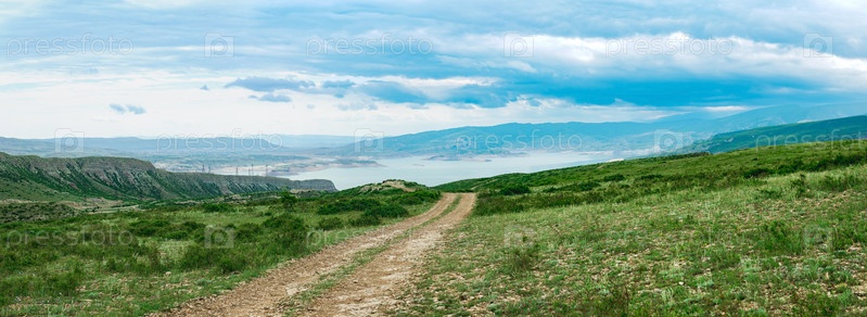 Горный пейзаж с грунтовой дорогой в районе водохранилища Чиркейской ГЭС в Дагестане