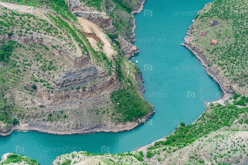 Вид сверху на горную реку Сулак в Дагестане с туристической лодочной базой