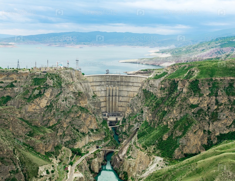 Горный пейзаж с арочной плотиной гидроэлектростанции и водохранилищем в каньоне