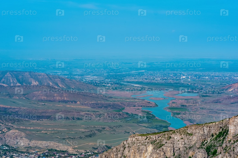 Горный пейзаж на Кавказе с видом на долину реки Сулак и города внизу на равнине