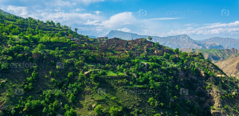 Руины домов на склоне горы в почти заброшенном селе Куриб, Дагестан