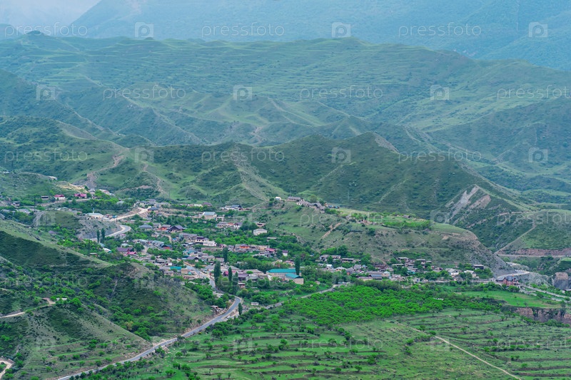 Вид с воздуха на деревню в горной долине среди садов и полей в Дагестане