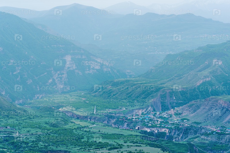 Туманная высокогорная долина с поселениями и полями между горными вершинами