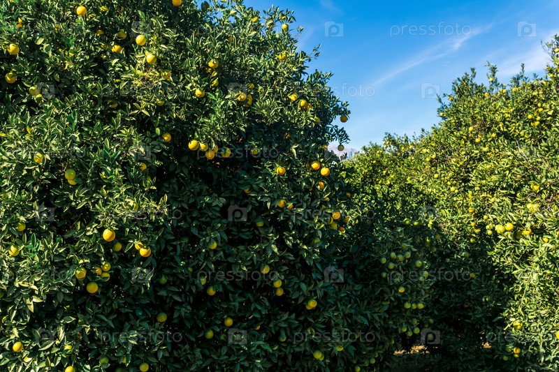Апельсиновые деревья со созревающими фруктами на плантации на открытом воздухе