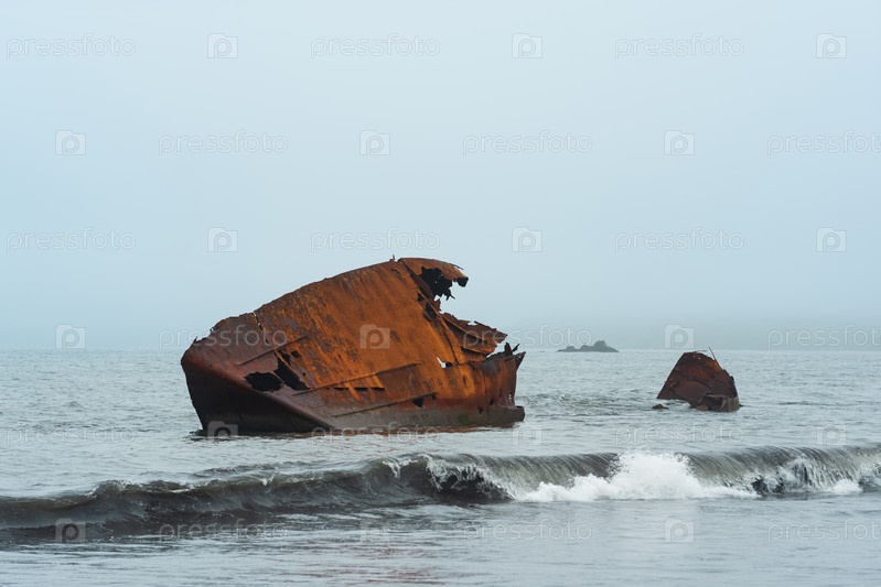 Старое кораблекрушение, фрагменты корабля, выброшенного на берег на фоне туманного морского пейзажа