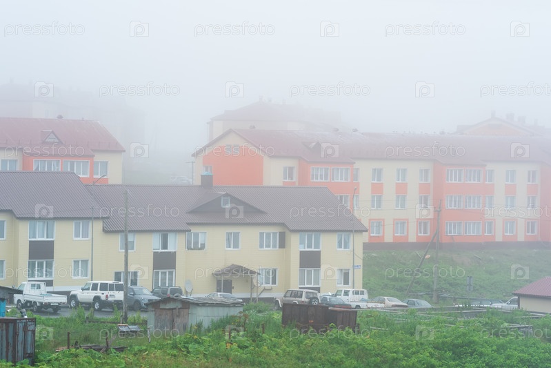 Вид на поселок Южно-Курильск на острове Кунашир во время тумана