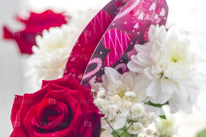 Закройте вверх по съемке букета валентинок с красивыми, яркими цветками и открыткой. Праздник