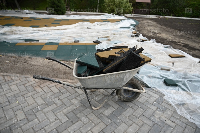 Низкий угол обзора мужских рук, измеряющих и выравнивающих песчаную и цементную плитку для точного покрытия наружного патио или тротуара. Строительная отрасль и ремонт