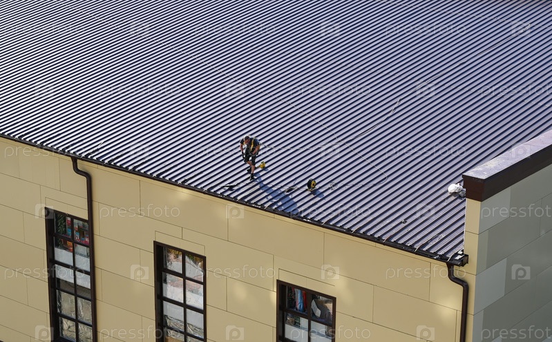 Неузнаваемый кровельщик в униформе, использующий пневматический или пневматический гвоздевой пистолет и укладывающий асфальтовую или битумную черепицу на крышу строящегося дома