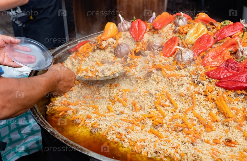 Повар кладет горячий вкусный плов из казана в пластиковую тарелку. Азиатская уличная еда