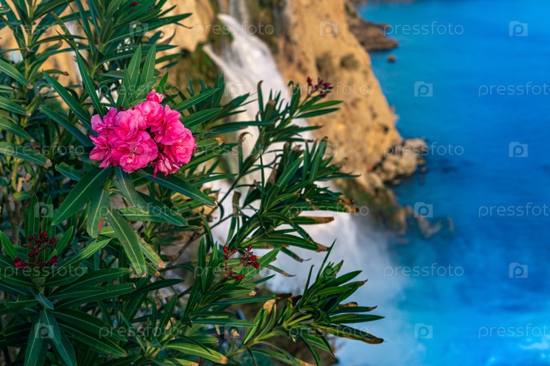 Фиолетовый цветок олеандра на скале на фоне большого водопада