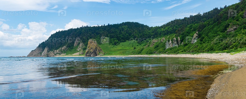 Прибрежный пейзаж, скалистое зеленое побережье острова Кунашир, песчаный пляж с водорослями на побережье во время отлива на переднем плане