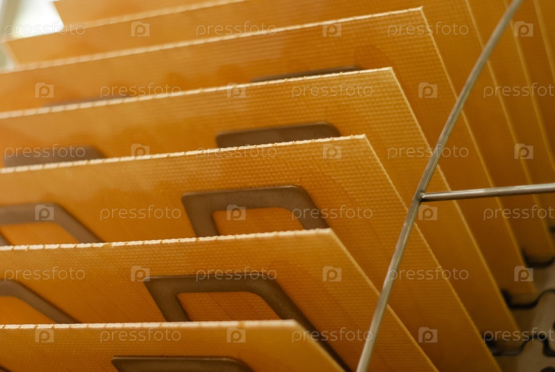 Фон: свежеиспеченные вафельные листы на конвейере кондитерской фабрики