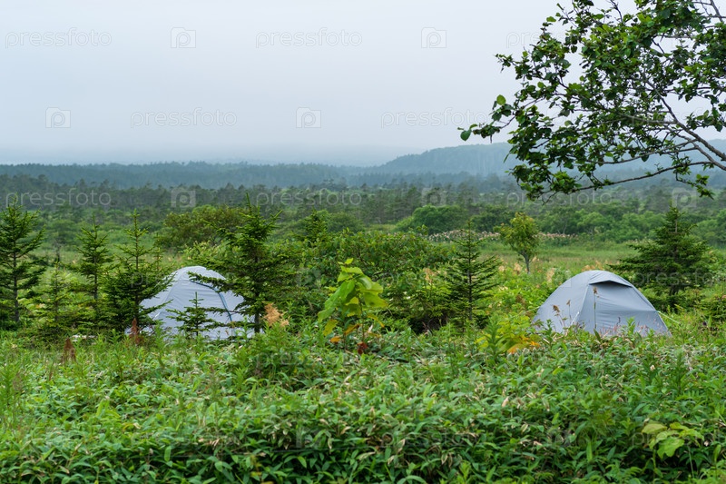 Туристическая палатка среди травы в облачной долине