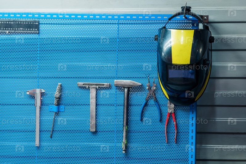 Сварочная маска висит на подставке с инструментами
