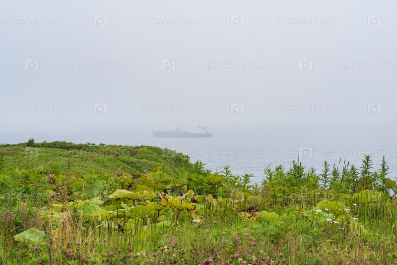 Вид с высокого травянистого берега моря в туманный день, сквозь туман виден корабль в море