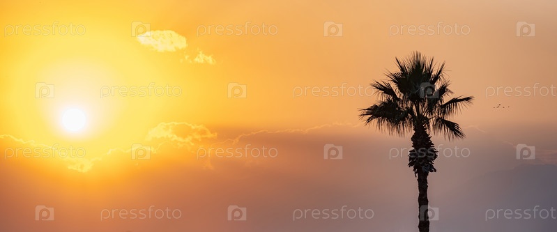 Яркое небо заката или восхода солнца с туманными горами и силуэтом пальмы на переднем плане