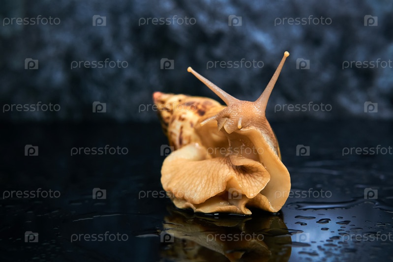 Живая улитка смотрит на гладкую черную поверхность на темном фоне