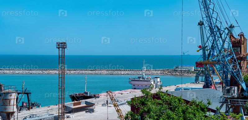 Почти пустой грузовой морской порт с кранами и судном под погрузкой