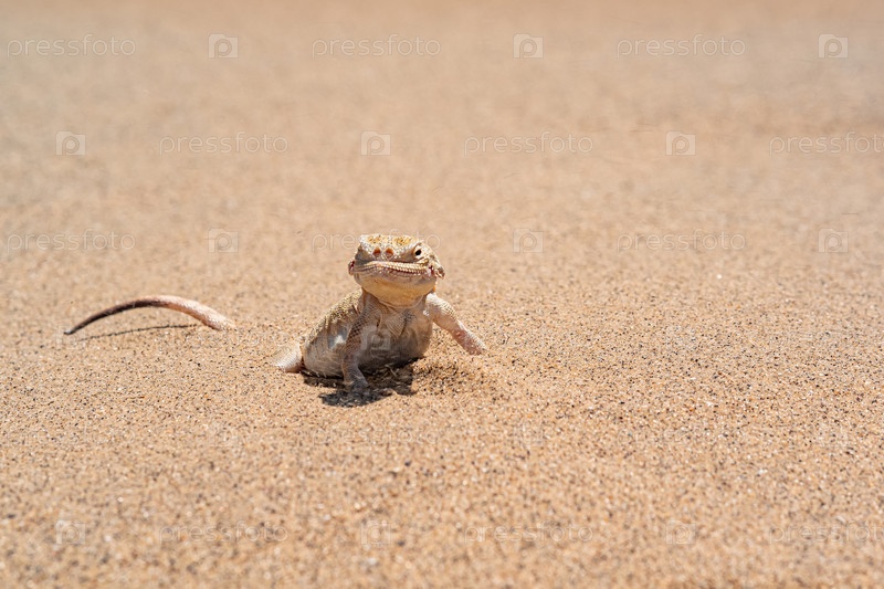 Пустынная ящерица-жабоголовая агама, наполовину зарывающаяся в песок, крупный план