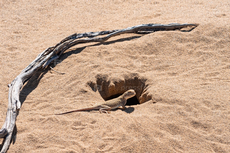Жабоголовая ящерица-агама возле своей норы в песке пустыни