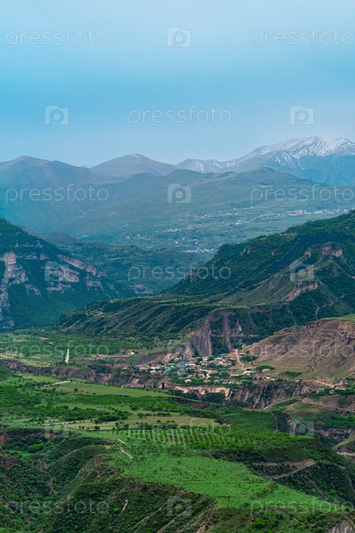 Туманная высокогорная долина с деревнями и полями между горными вершинами в Дагестане