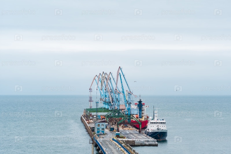 Грузовой причал с портовыми кранами и пришвартованными кораблями на фоне открытого моря