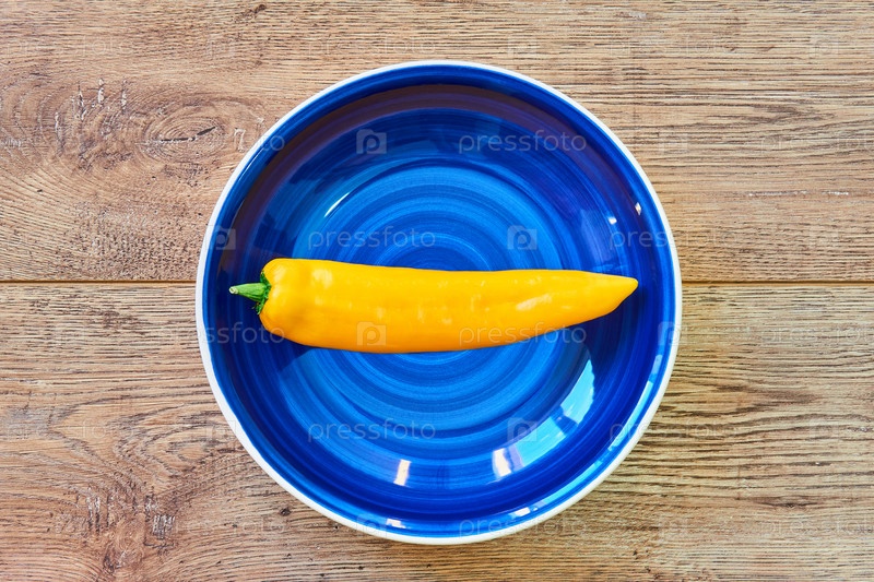 Стручок желтого перца на синей тарелке на деревянном столе
