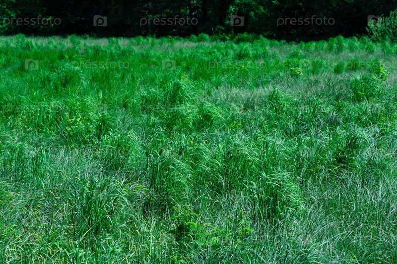 Изумрудно-зеленый луг с зеленой травой в ясный день