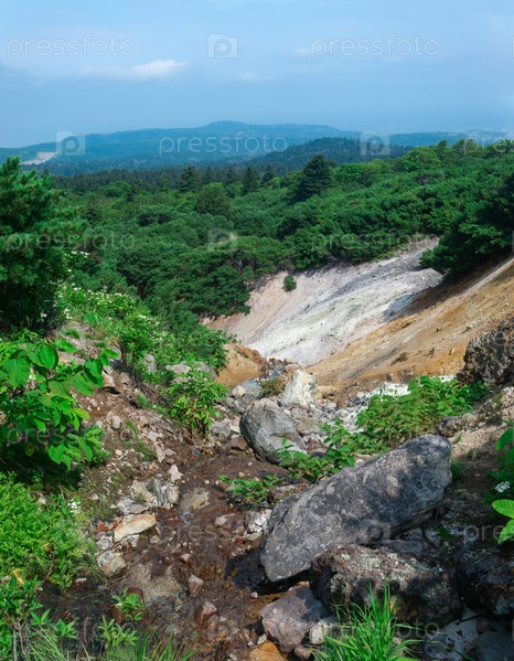 Пейзаж с геотермальным минерализованным ручьем на склоне вулкана Менделеева, остров Кунашир