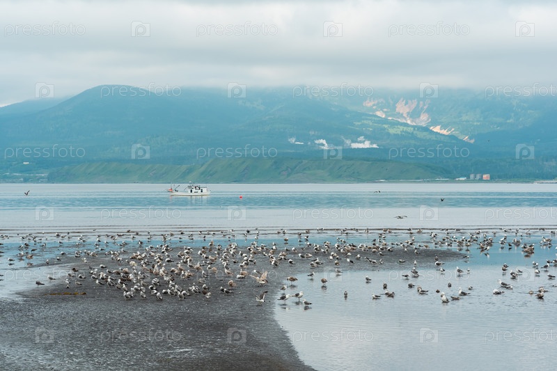 Чайки на мелководье во время отлива на фоне морского залива с туманным вулканом вдалеке, пейзаж возле города Южно-Курильска на острове Кунашир